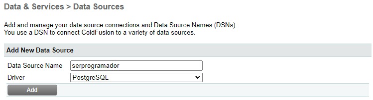 Para criar uma nova conexão, é muito simples. Basta inserir no campo Data Source Name o nome que deseja dar para a conexão, e então selecionar qual o driver do banco de dados que estaremos conectando. Por exemplo, para criar uma conexão PostgreSql para o Ser Programador faremos: